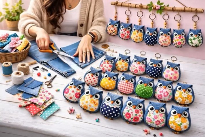 The Old denim owl keychain – Quilt Pattern is a charming and sustainable sewing project that transforms worn-out jeans into
