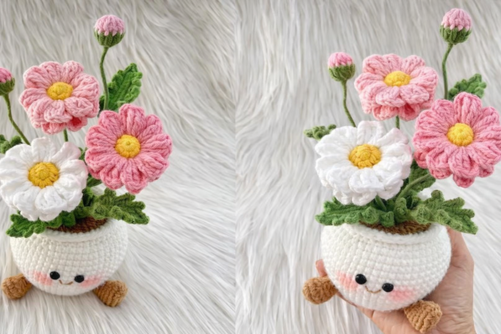 Crocheted daisy | Crocheted daisy flower vase – Pattern is a delightful crochet concept that blends floral beauty with handmade