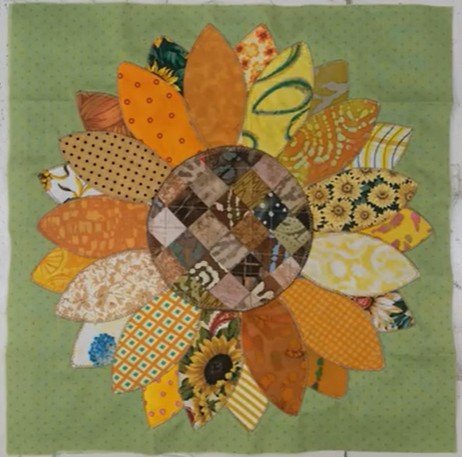 Patchwork block with sunflower appliqué in scrapbook style – Quilt e Pattern is a creative theme that blends traditional quilting