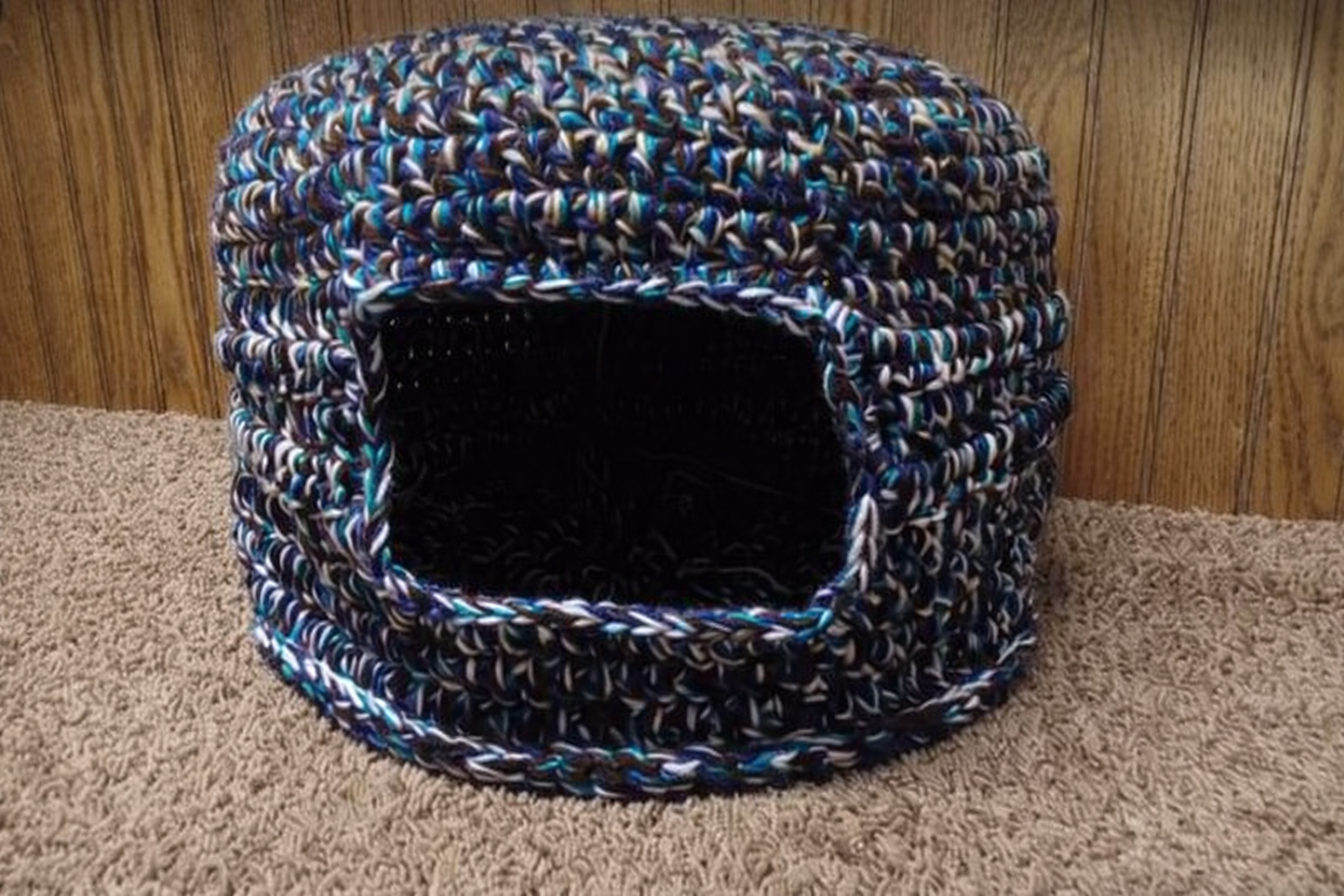 A Crocheted cat house – Pattern typically involves creating a structured, dome-like shape that can support itself while remaining soft and comfortable. The pattern often begins with a circular base, gradually building upward through increases and consistent stitching. This ensures stability and enough space for your cat to curl up inside.