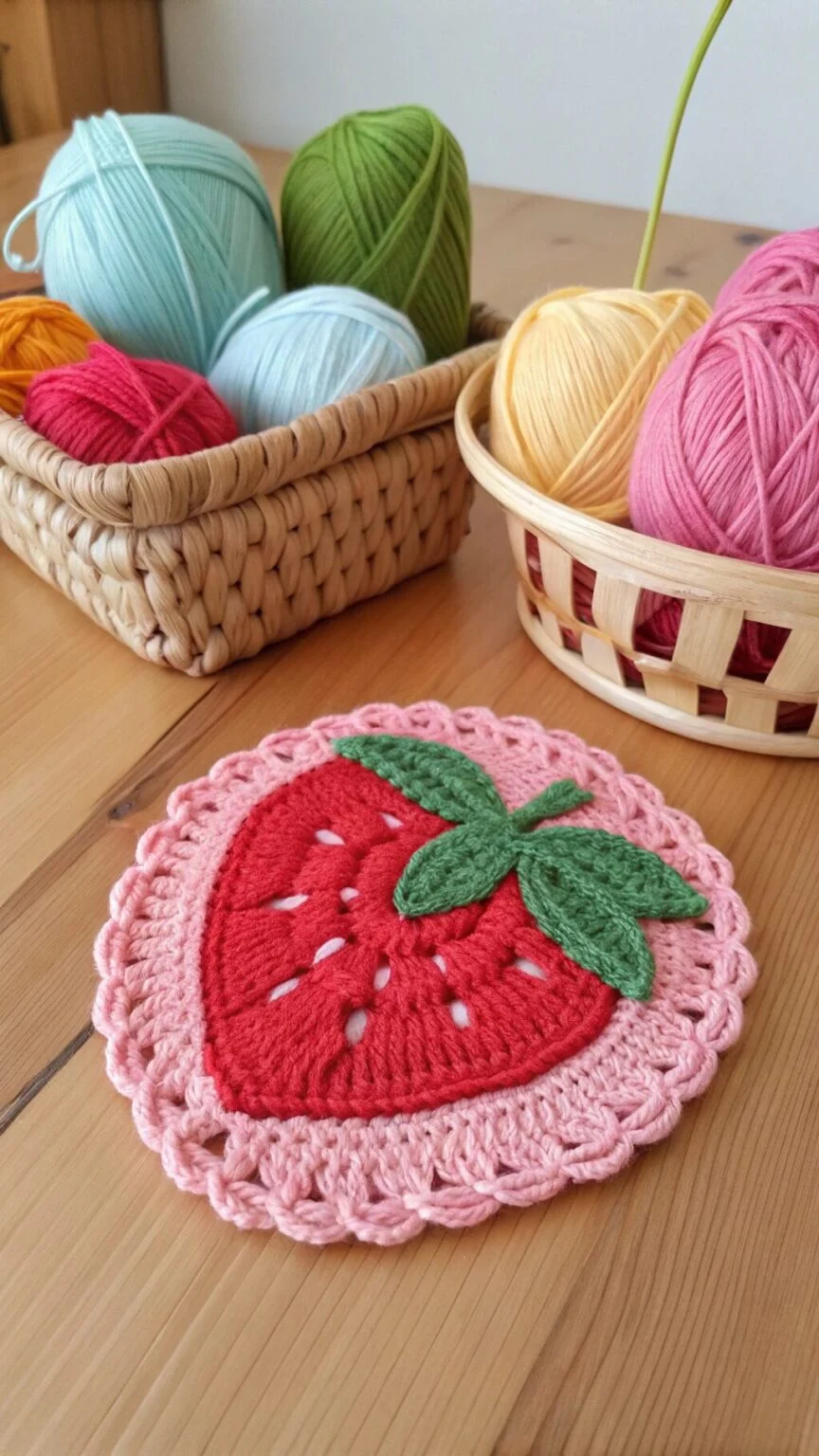 When designing the strawberry coaster, many crafters are inspired by the fruit’s natural textures and colors — the vibrant red body, tiny seeds, and green leafy top. These details can be beautifully recreated using yarn, transforming an ordinary drink coaster into an adorable piece of art. The result is a cozy, handmade creation that makes every cup of tea or coffee feel more special.
