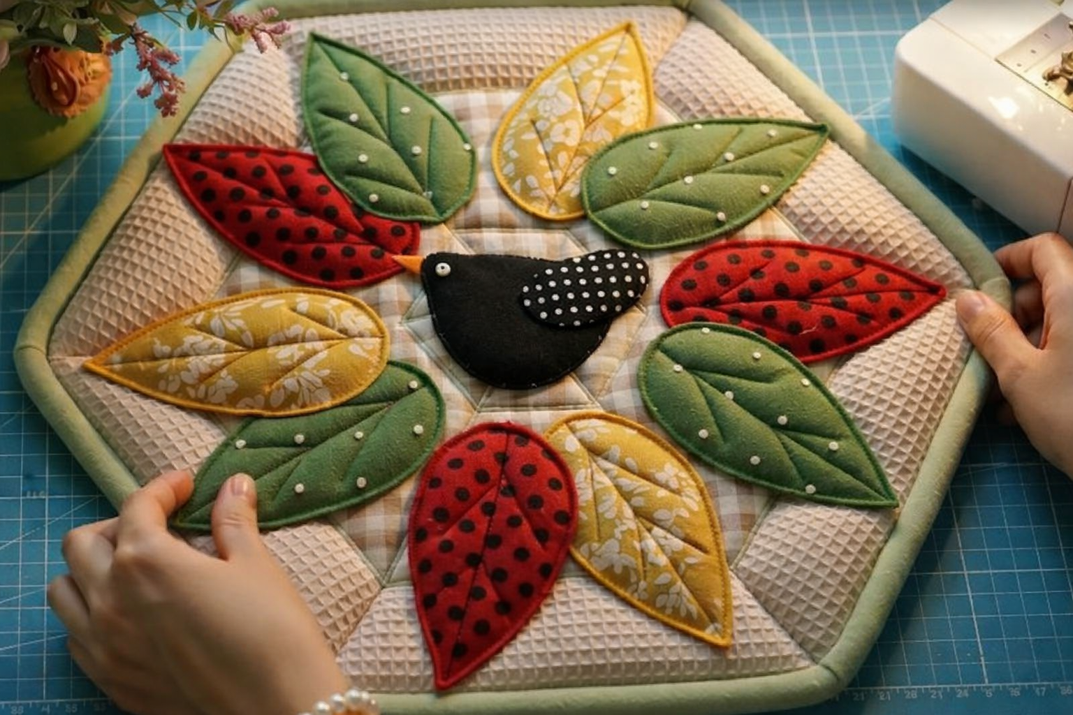 Begin stitching the appliqué pieces onto the base fabric. You can use a straight stitch, zigzag stitch, or decorative stitches depending on your preference. Each technique adds a unique texture to the patchwork leaf and bird appliques.